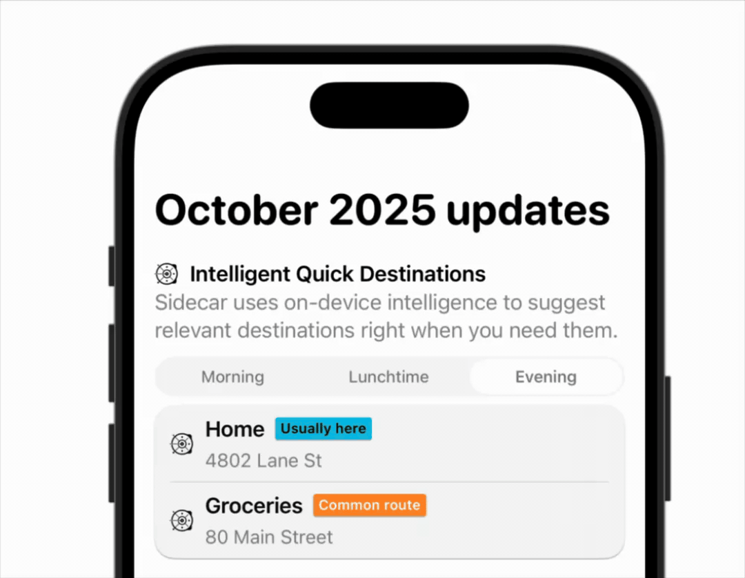 Sidecar+ subscribers using trip logging now have a dramatically improved Quick Destinations algorithm that fuses your favorite places with your weekly routines. Your entire trip logging history is provided to Sidecar’s on-device intelligence to provide uncannily accurate suggestions that are just a tap away in CarPlay.